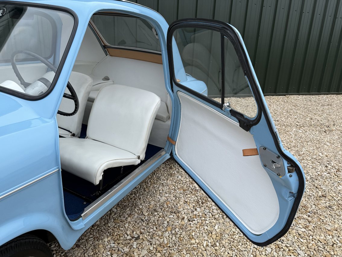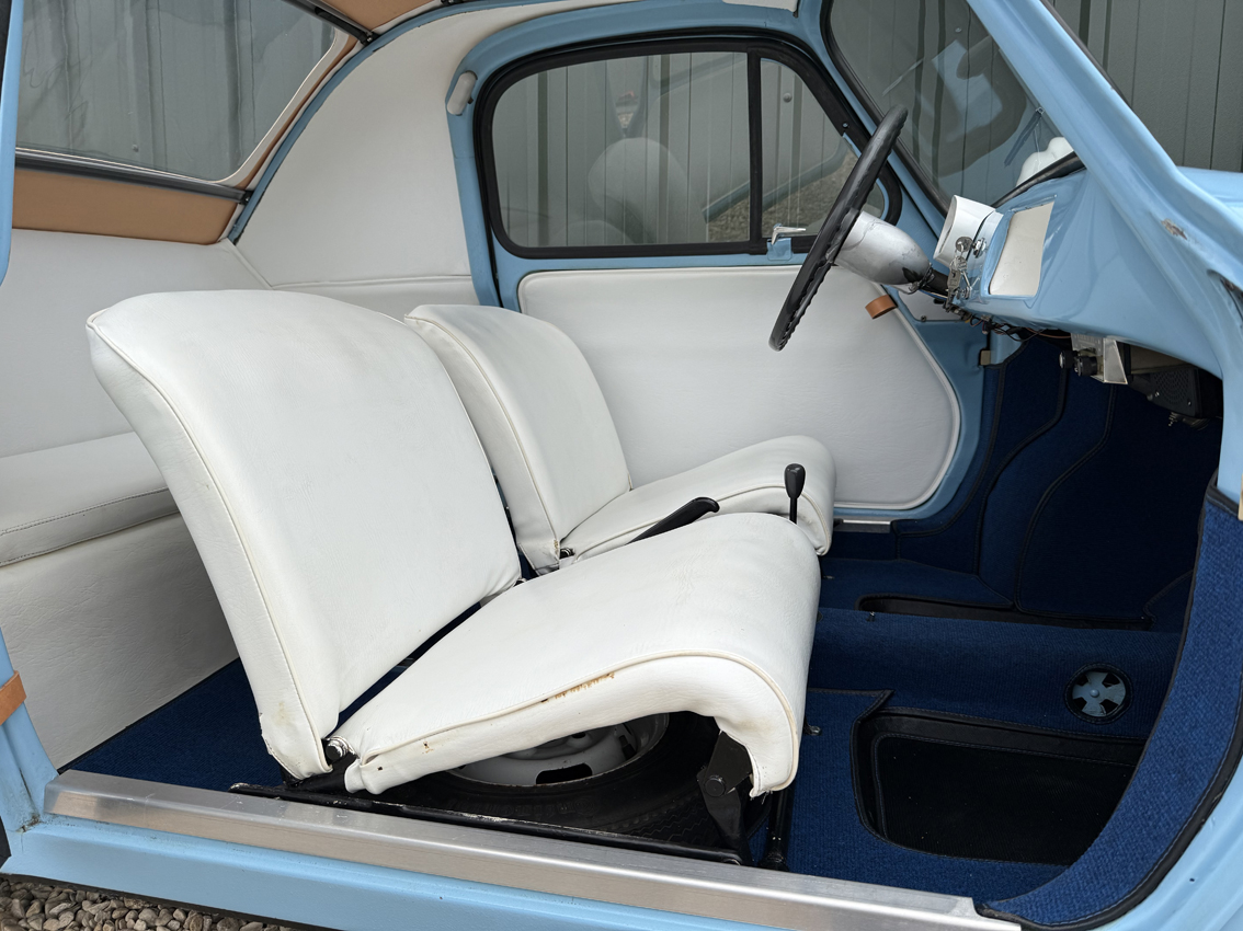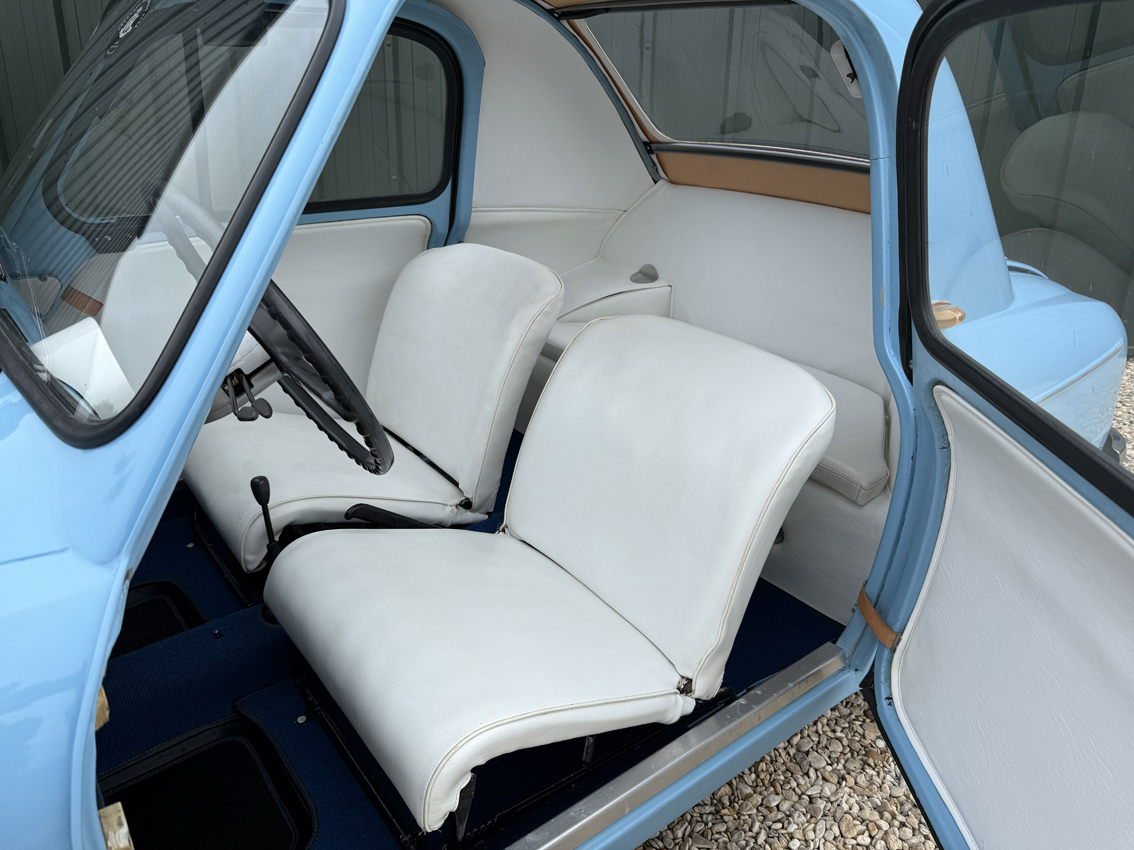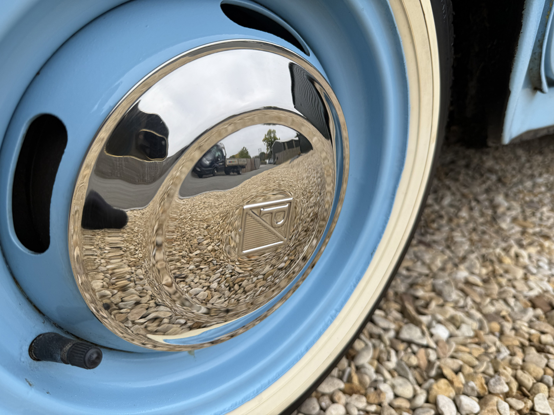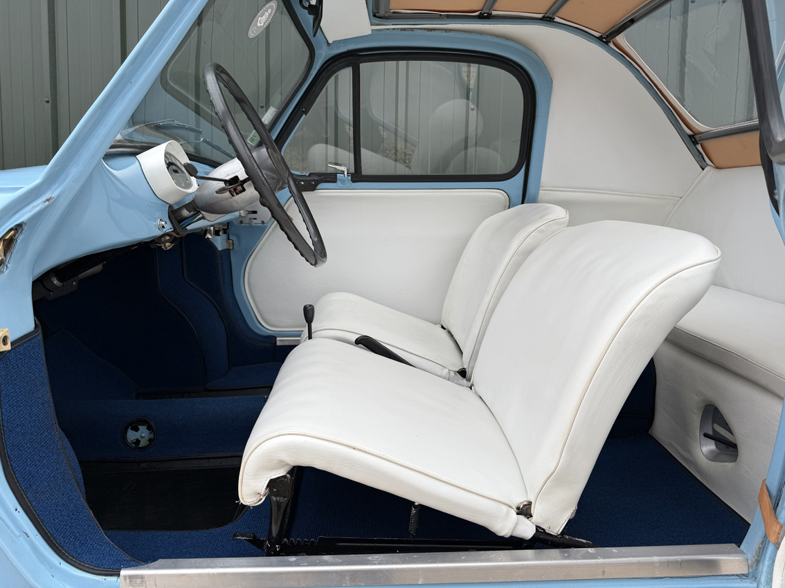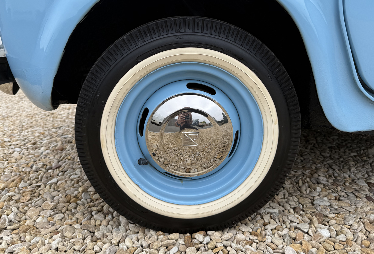 Blue with white roll down roof, white seats, white wall tyres, LHD, 2+2 seating, no seat belts, 3-speed manual gearbox, 2 stroke air cooled engine, suicide doors, period radio and speaker, front ‘drawer’, full size spare wheel under the passenger seat.