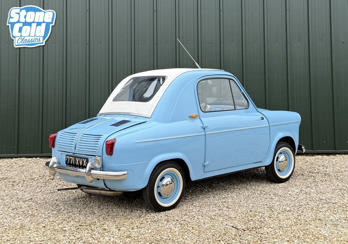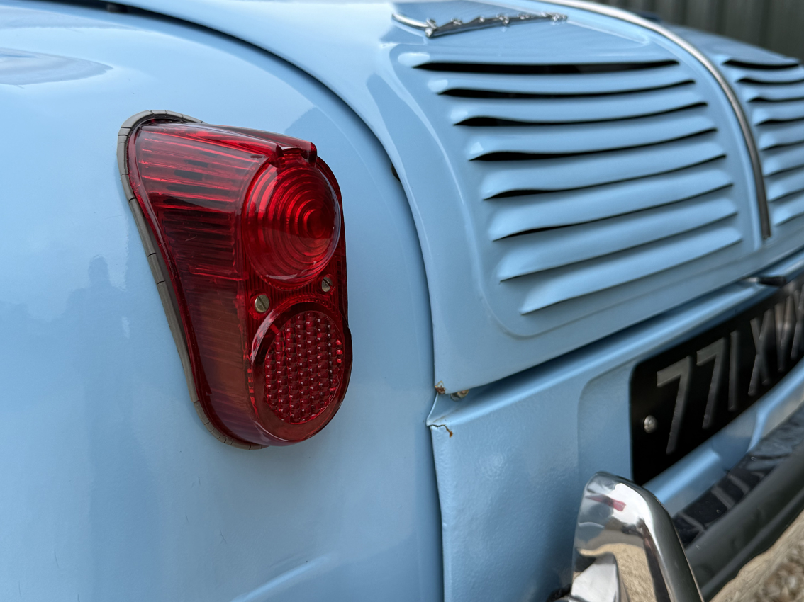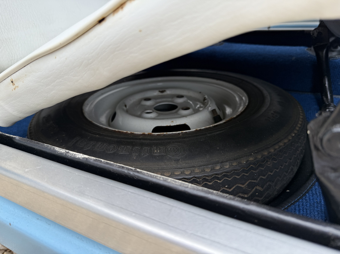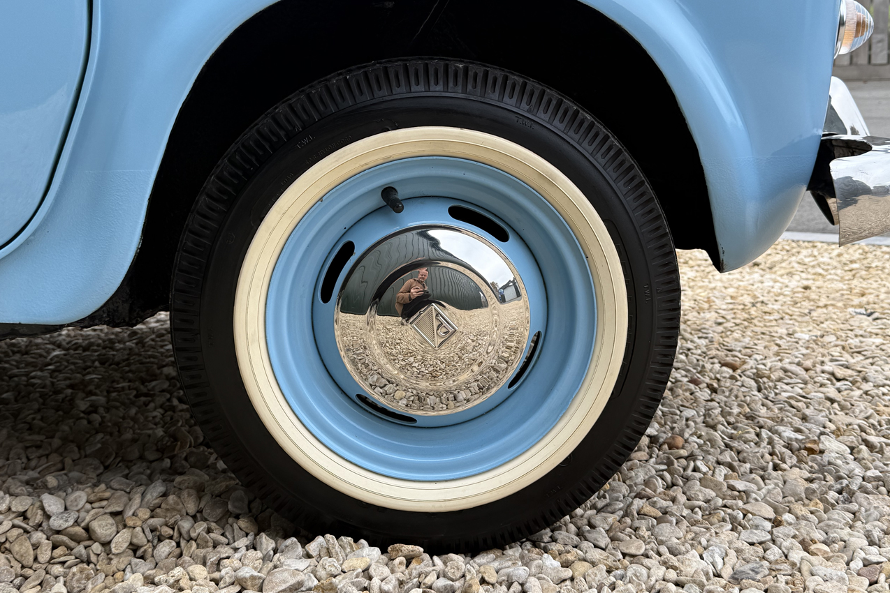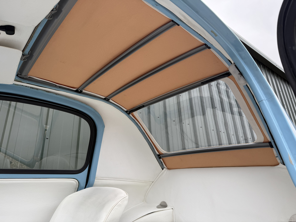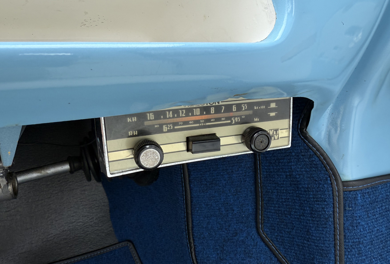 Blue with white roll down roof, white seats, white wall tyres, LHD, 2+2 seating, no seat belts, 3-speed manual gearbox, 2 stroke air cooled engine, suicide doors, period radio and speaker, front ‘drawer’, full size spare wheel under the passenger seat.
