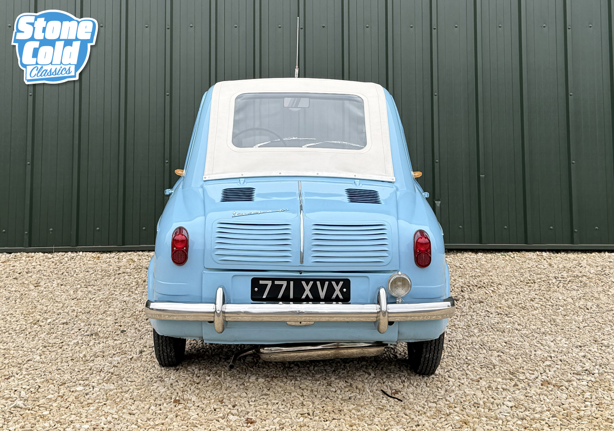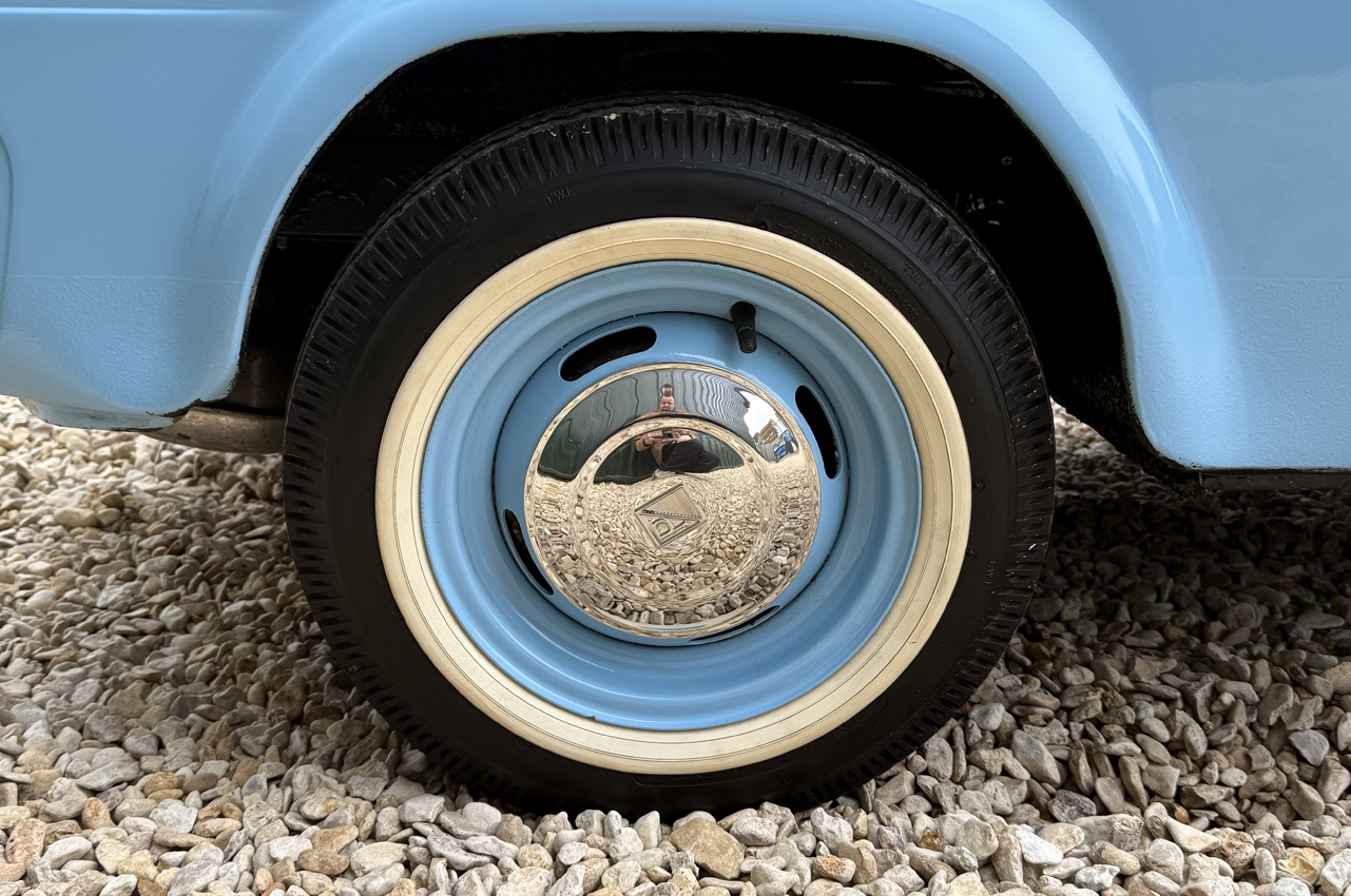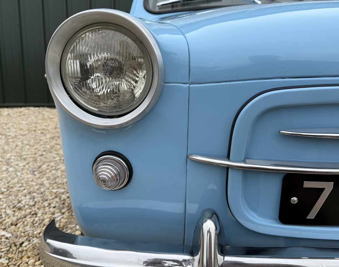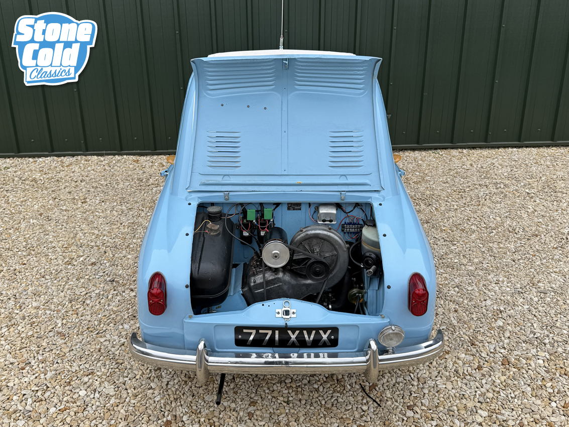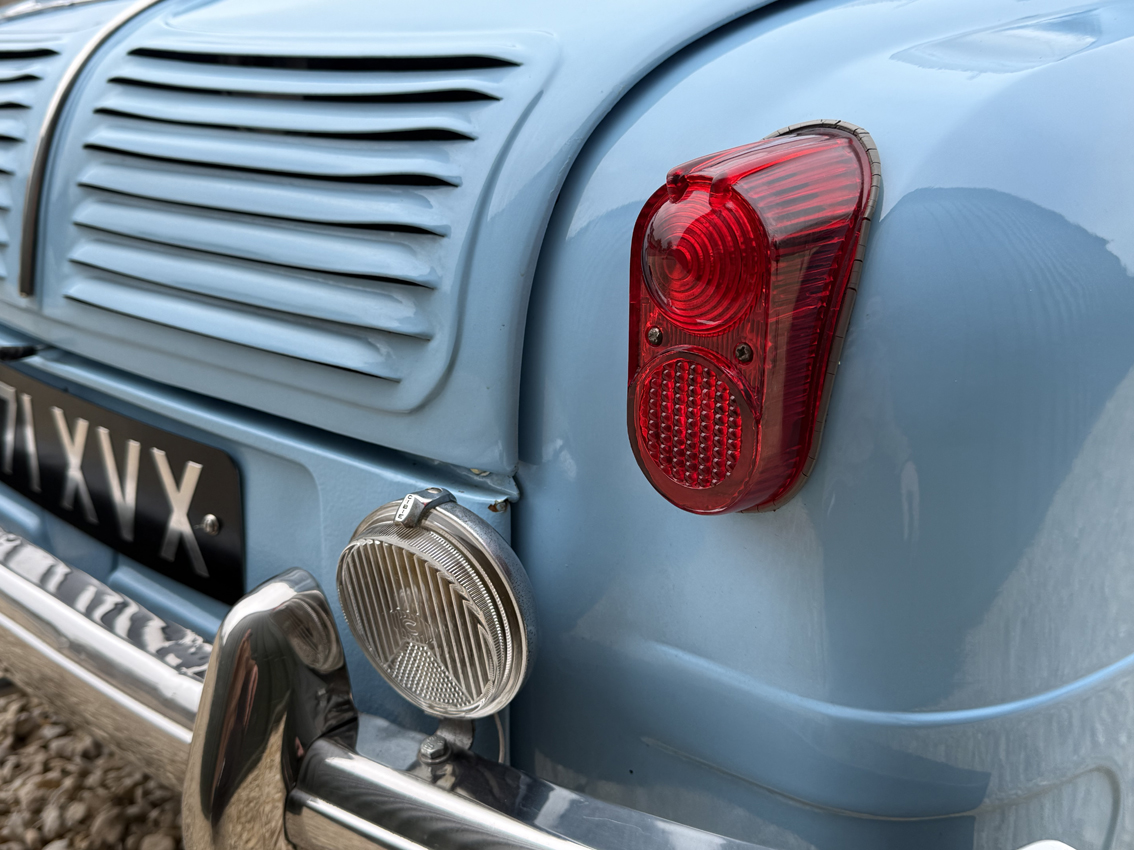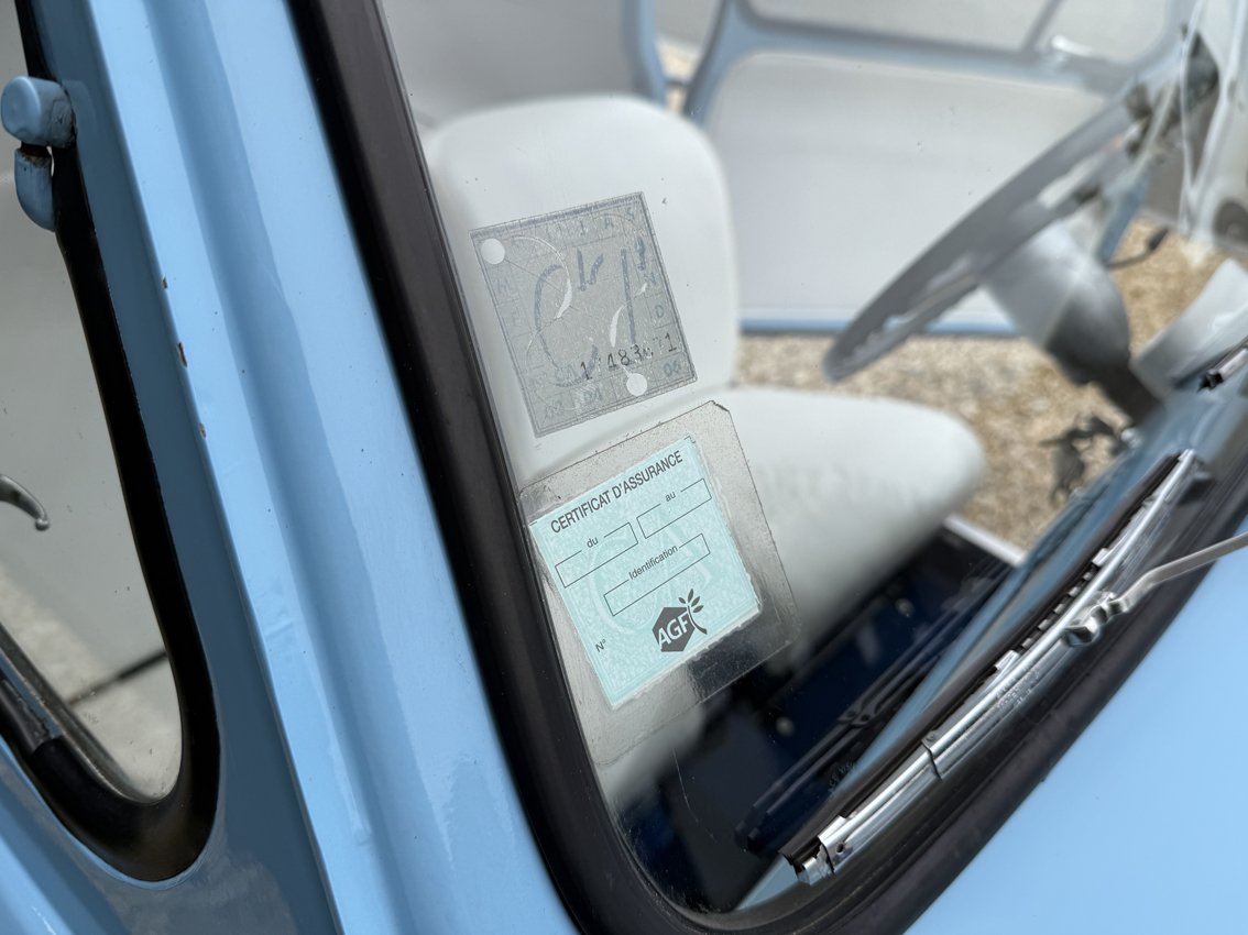 Blue with white roll down roof, white seats, white wall tyres, LHD, 2+2 seating, no seat belts, 3-speed manual gearbox, 2 stroke air cooled engine, suicide doors, period radio and speaker, front ‘drawer’, full size spare wheel under the passenger seat.