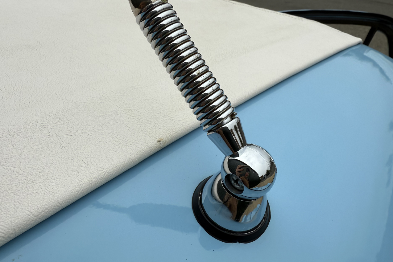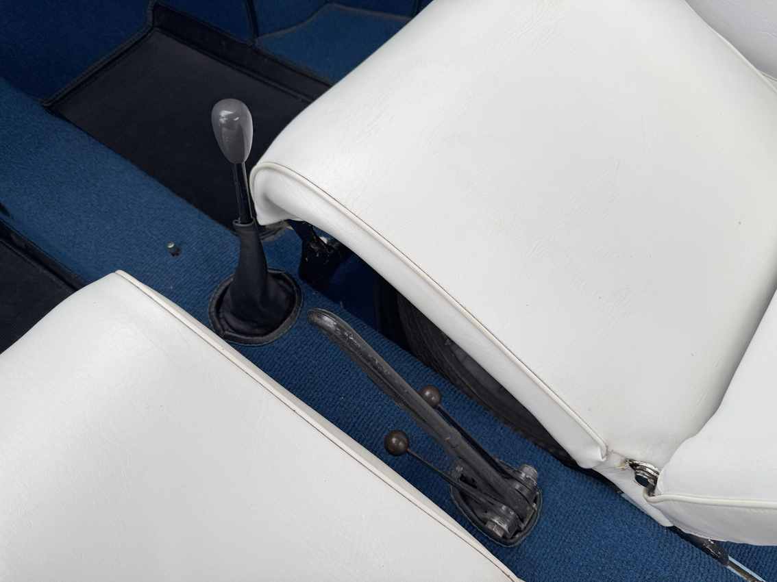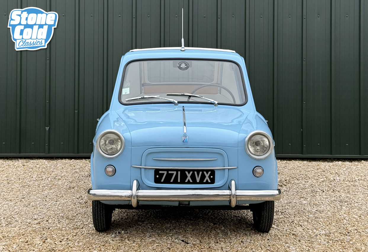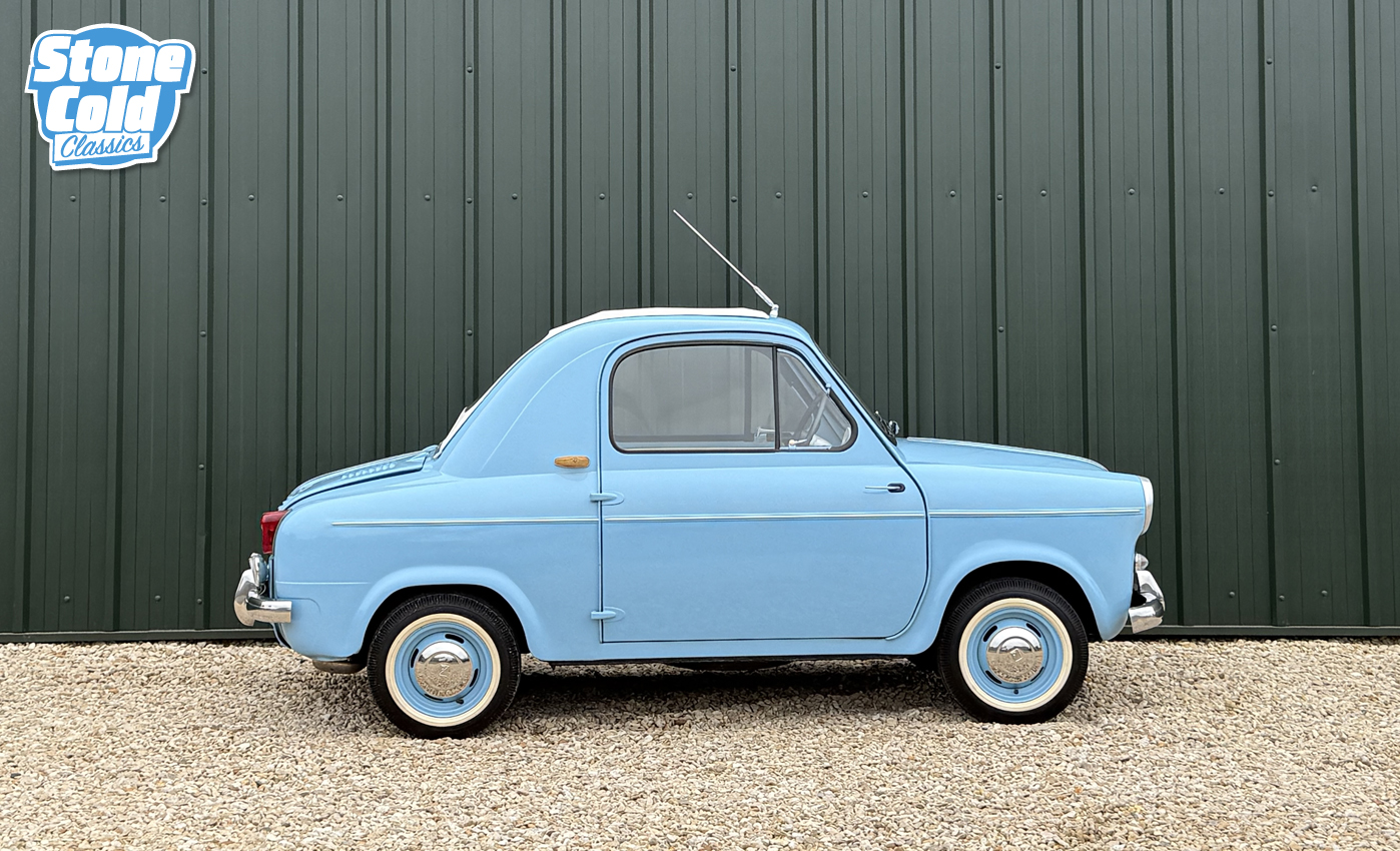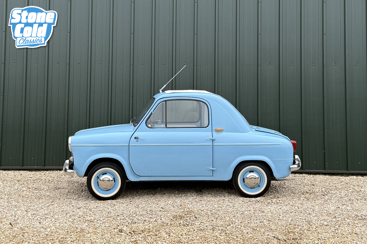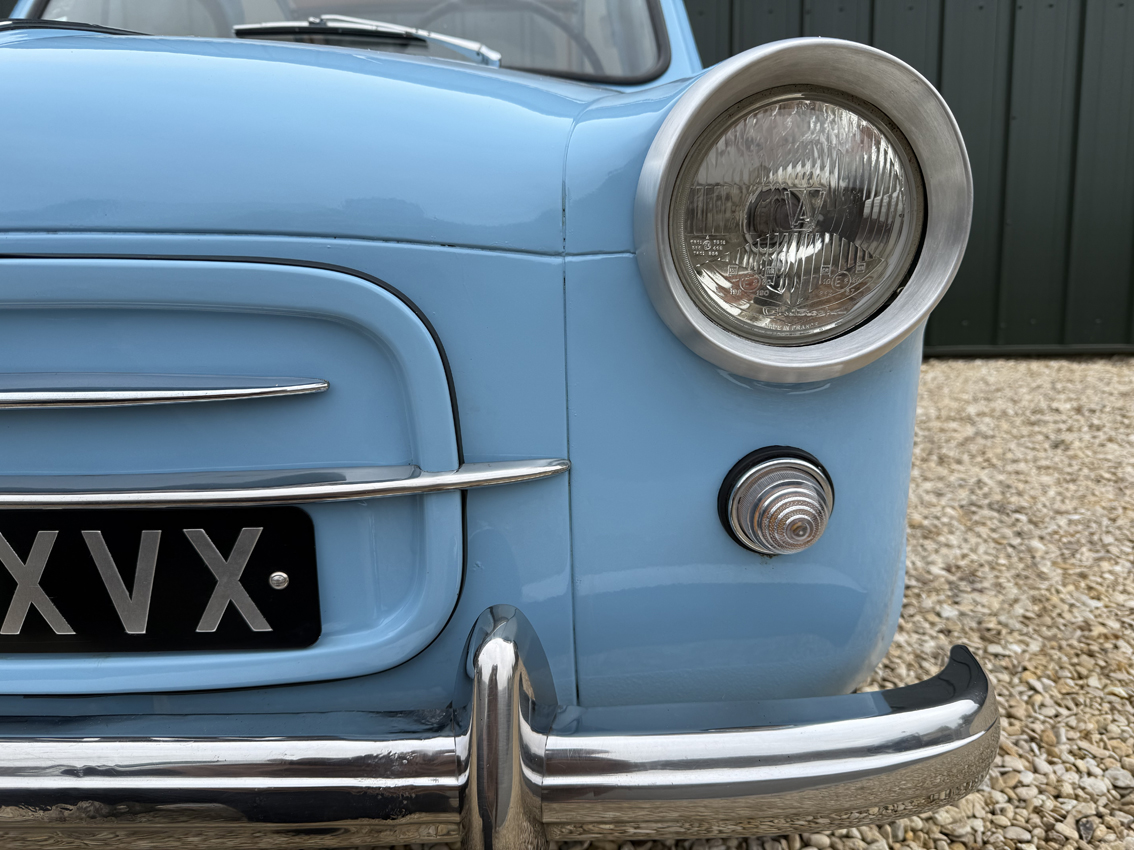 Blue with white roll down roof, white seats, white wall tyres, LHD, 2+2 seating, no seat belts, 3-speed manual gearbox, 2 stroke air cooled engine, suicide doors, period radio and speaker, front ‘drawer’, full size spare wheel under the passenger seat.