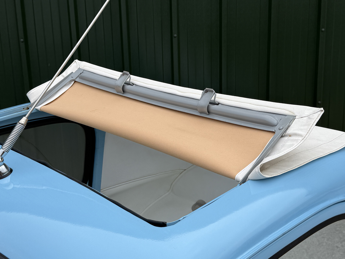 Lovely glossy paint all-round with some marks and chips around the body (see my youtube video for a full condition report), wheels in excellent shape with brand new chrome hubcaps, excellent tyres with plenty of tread all round, lovely interior with just light wear and some marks to the very white seats. Roll back roof is brand new. The dashboard is remarkable and undamaged. The engine bay presents very well. The underneath is very smart and shows none of the usual rot. A beautiful example that drives superbly and needs nothing to enjoy. Two keys, lots of invoices and photos in various states of restoration. It is tax and MOT exempt and is registered as a Historic Vehicle which makes it ULEZ exempt as well. Huge fun!