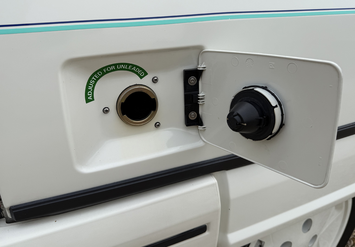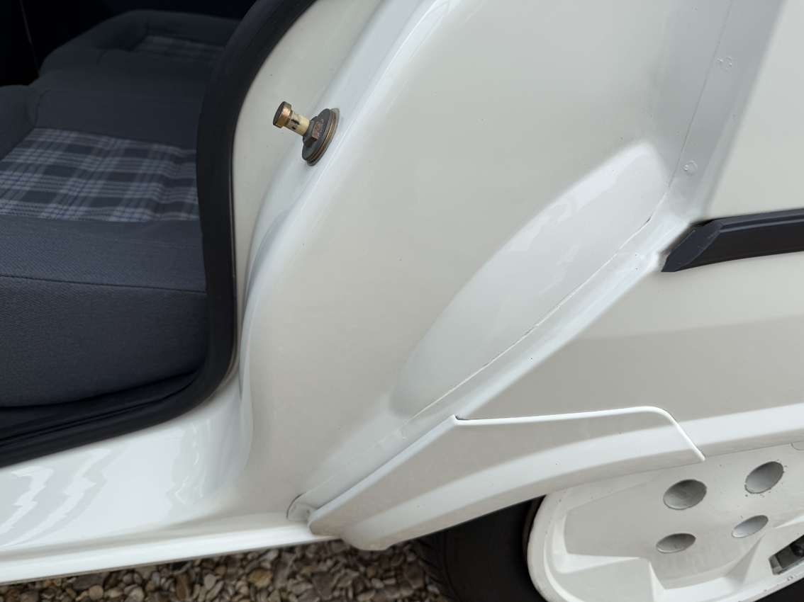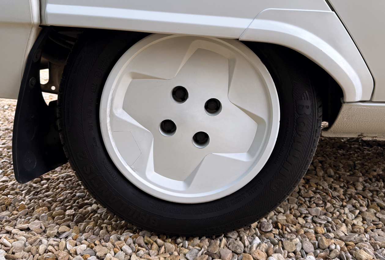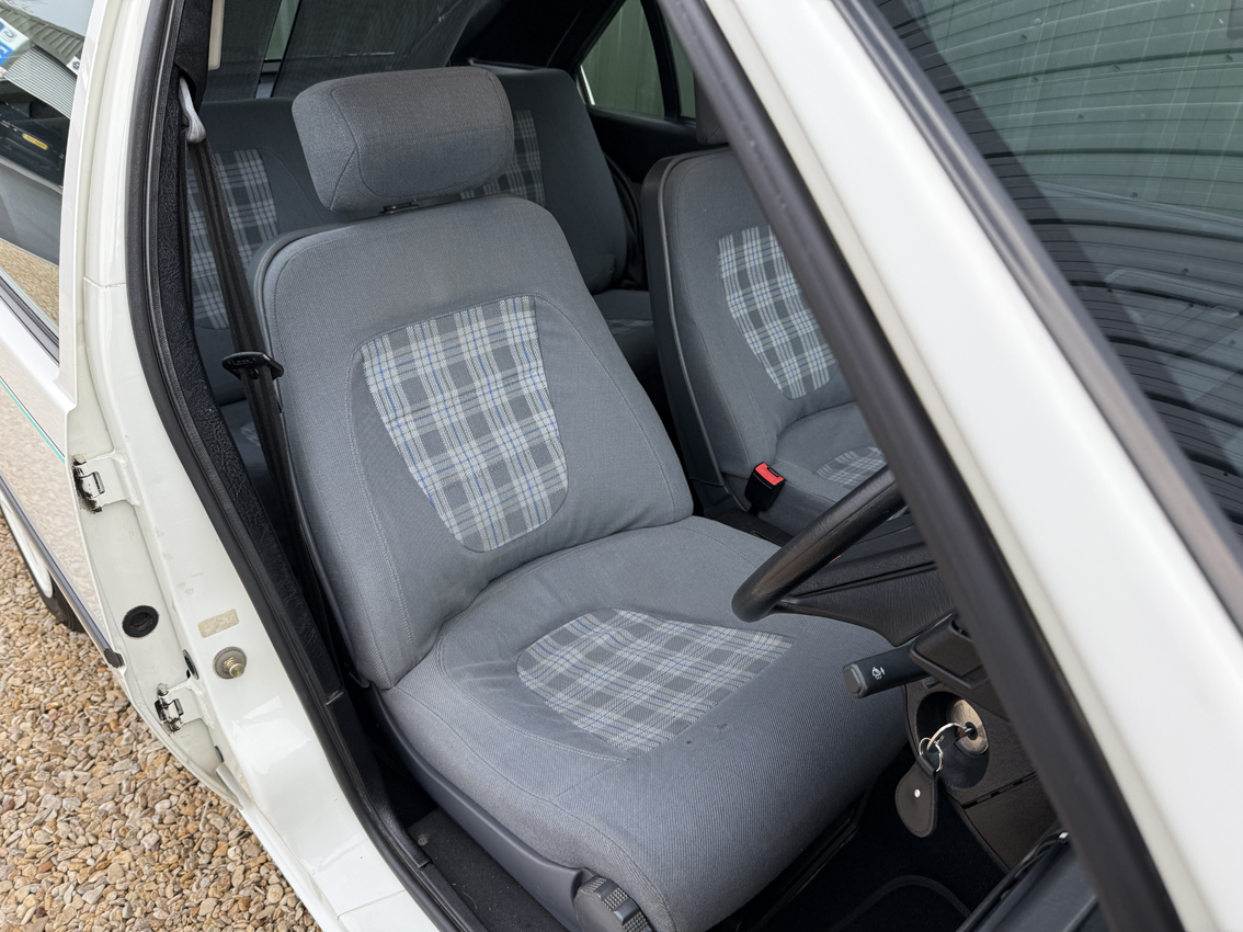 Alpine White with exclusive check upholstery. Central locking, glass tilt/removable sunroof, colour coded bumpers, rear wash wipe, green tinted windows with rear sunblinds, cigar lighter, clock, rear seat belts, JVC radio/CD player (after market), reclining front seats, internally adjustable door mirrors, St Tropez graphics. No power steering but the car is surprisingly light to drive.