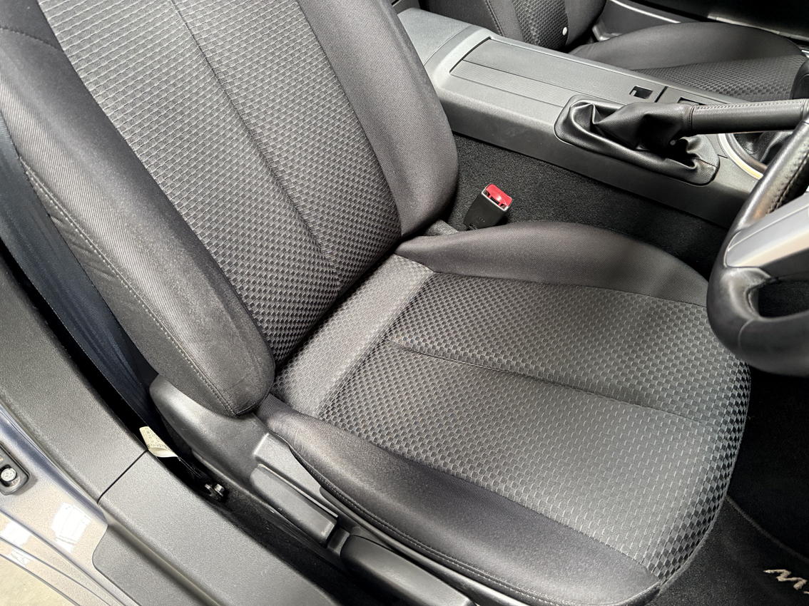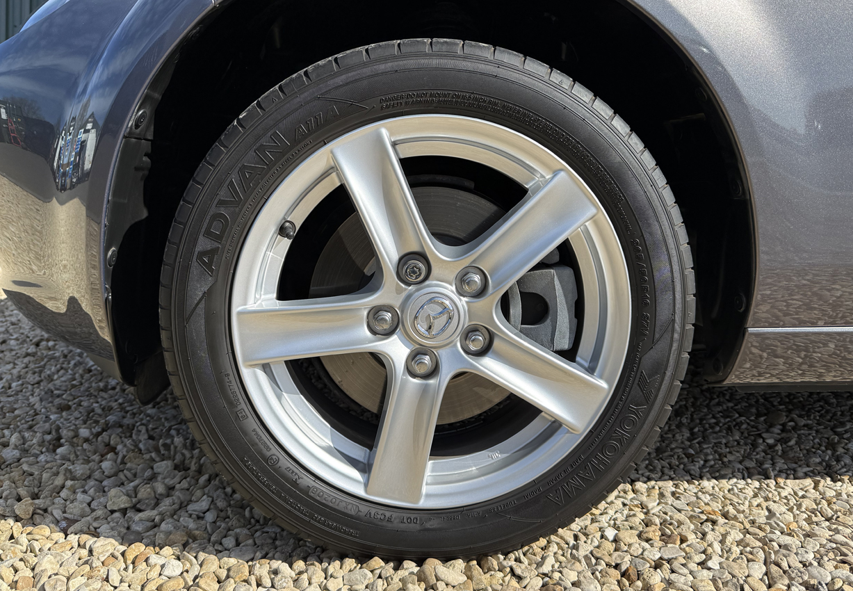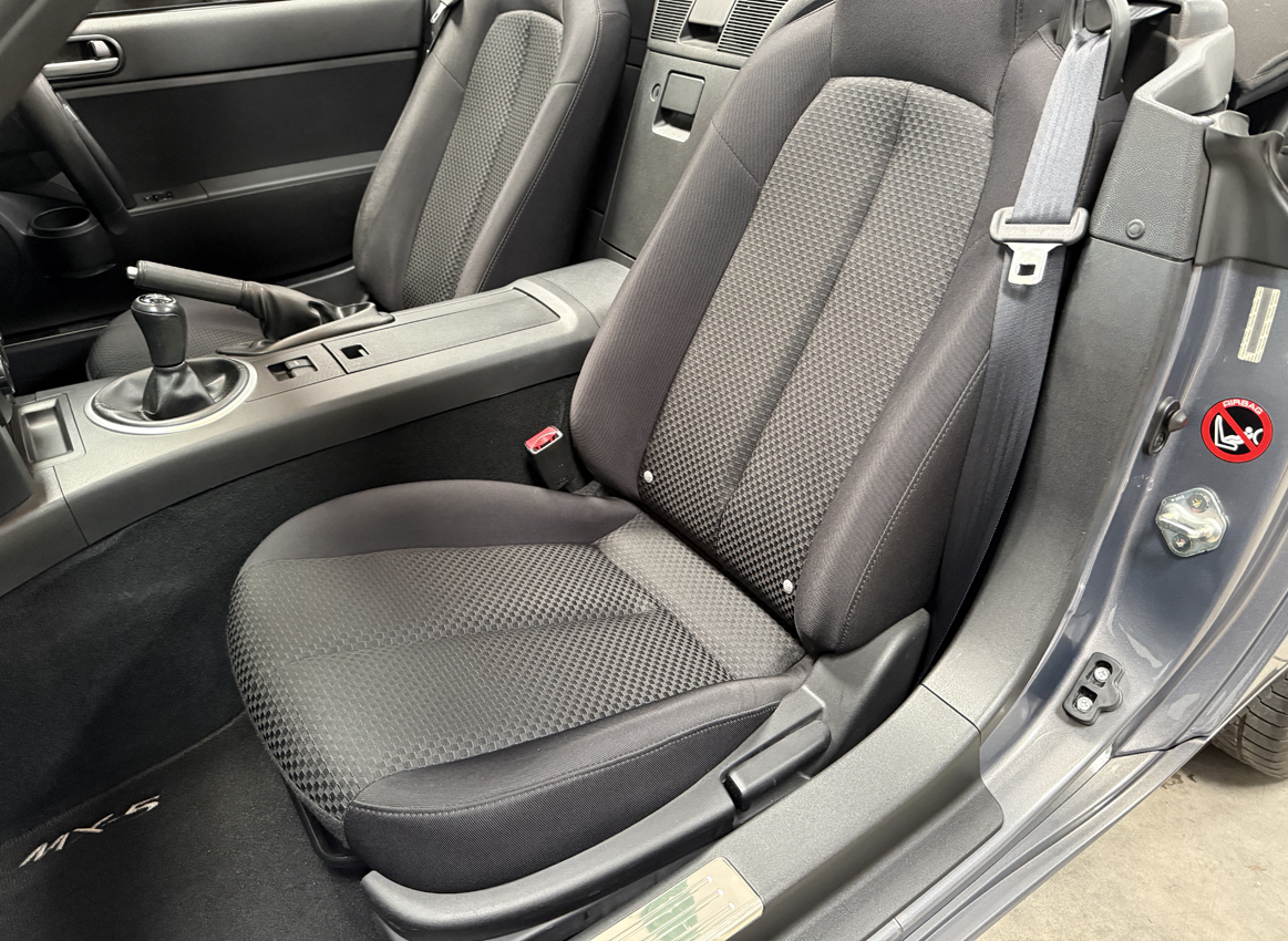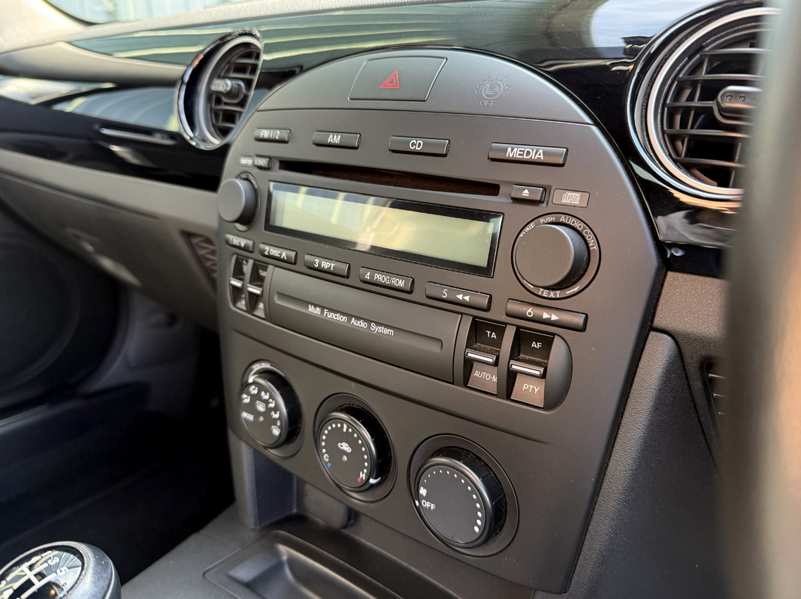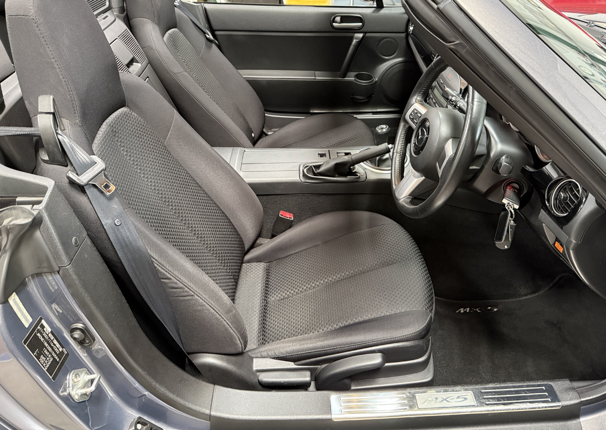 Galaxy Grey Mica with black cloth trim, 16 inch Design 110 alloy wheels, electric windows, electric mirrors, air compressor ‘spare’, tool kit, steering wheel controls, 5-speed gearbox, CD player, drivers airbag, OEM floor mats. The Option Pack includes the Design 110 wheels and Premium black soft top with heated screen, leather steering wheel with audio controls, black leather gear knob with black leather handbrake, stainless steel polished scuff plates with MX5 logo, six speakers, front tunnel storage net (passenger).