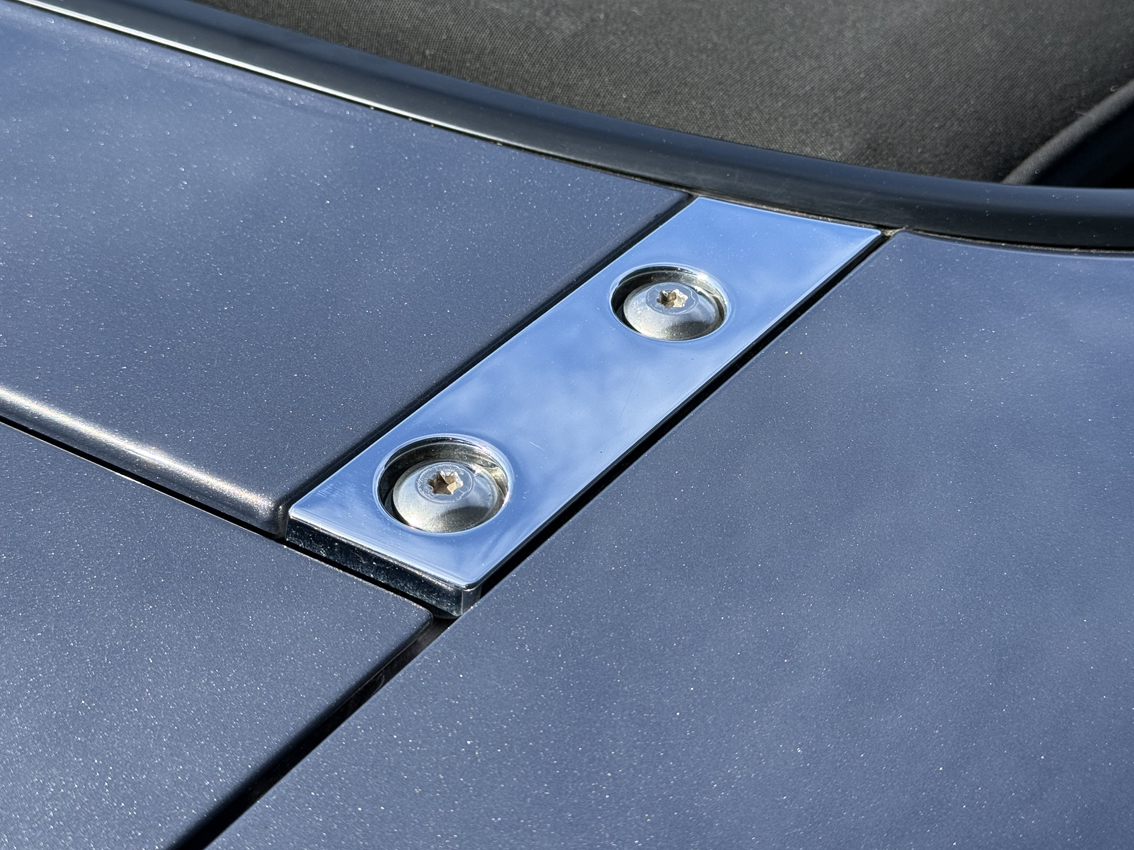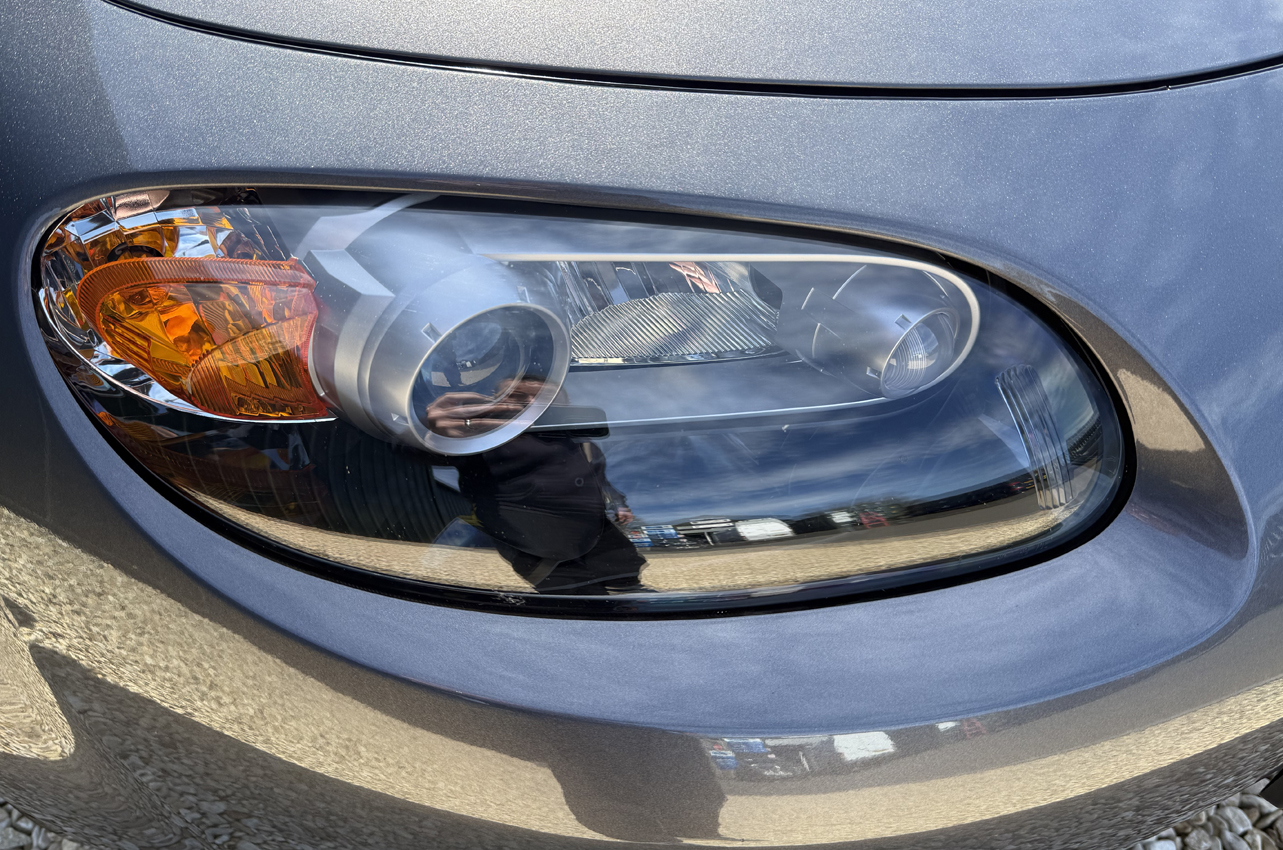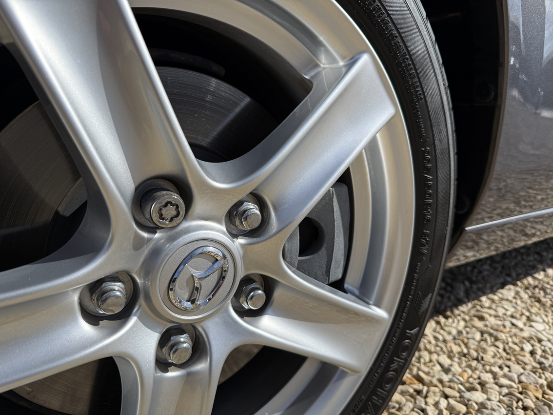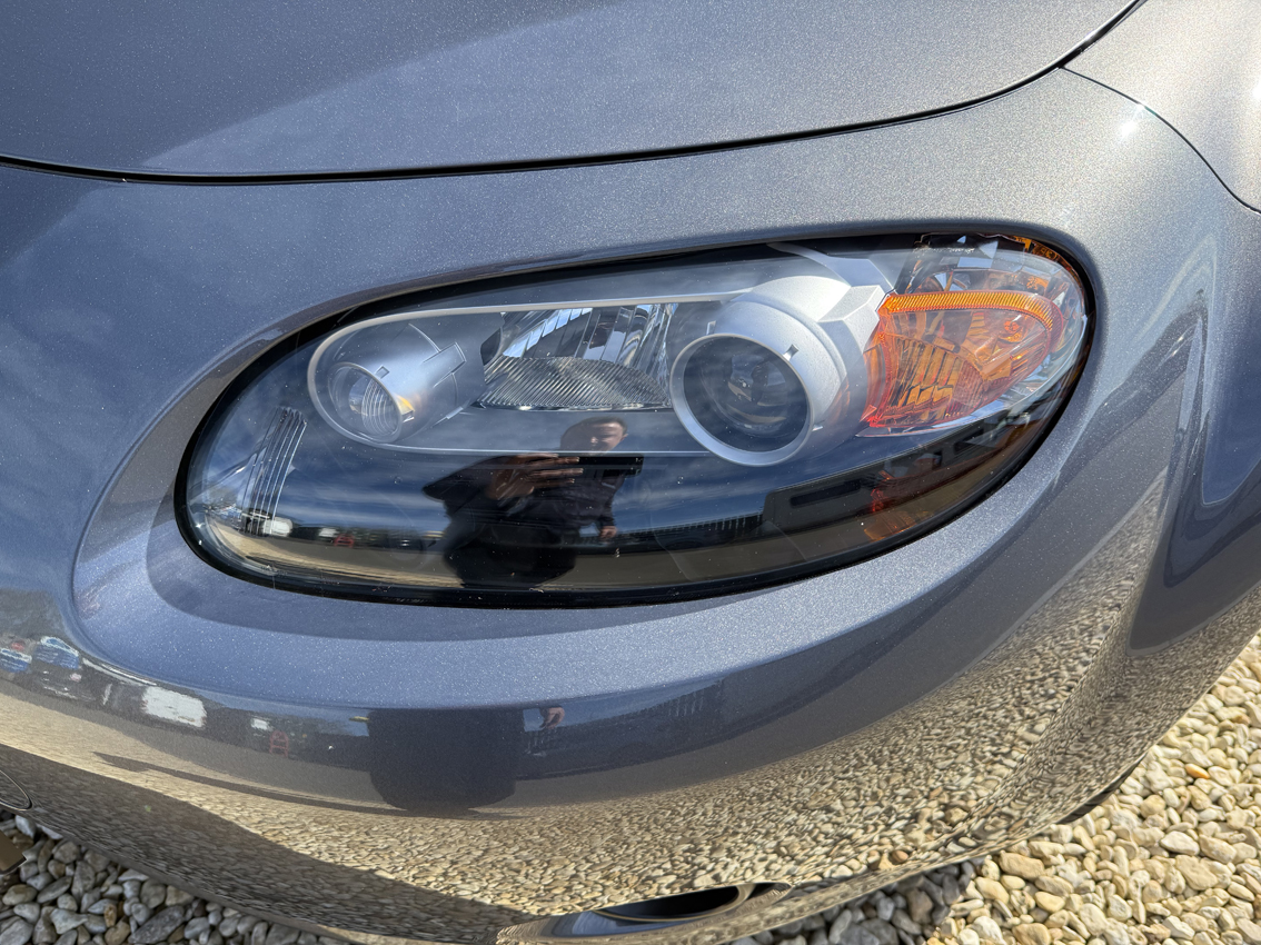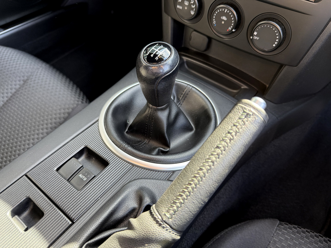 Galaxy Grey Mica with black cloth trim, 16 inch Design 110 alloy wheels, electric windows, electric mirrors, air compressor ‘spare’, tool kit, steering wheel controls, 5-speed gearbox, CD player, drivers airbag, OEM floor mats. The Option Pack includes the Design 110 wheels and Premium black soft top with heated screen, leather steering wheel with audio controls, black leather gear knob with black leather handbrake, stainless steel polished scuff plates with MX5 logo, six speakers, front tunnel storage net (passenger).